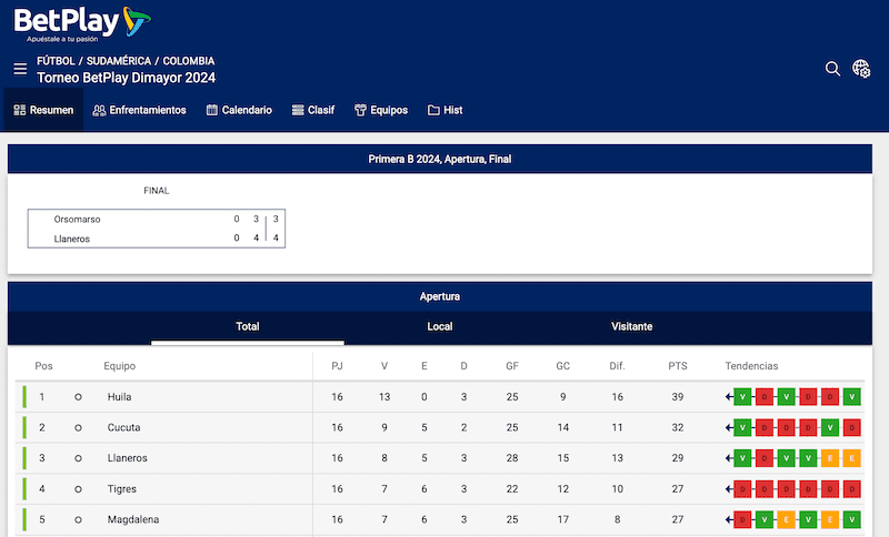 Dependiendo del deporte, la información ofrecida incluye varias pestañas: