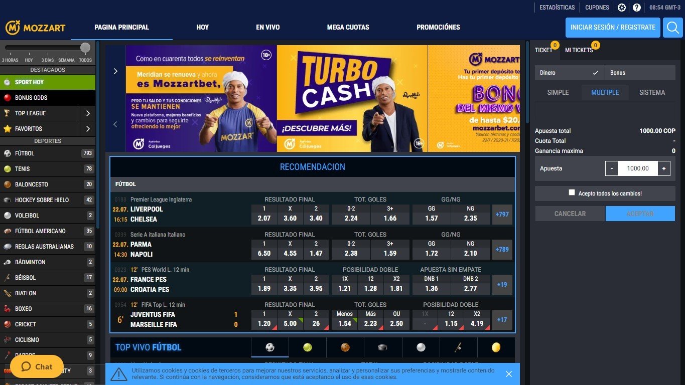 Mozzarbet ofrece una gran cantidad de variantes para participar de las apuestas deportivas. Se destaca principalmente en el fútbol, siendo el deporte que más mercados tiene a disposición del usuario. Sin embargo, se pueden encontrar muchos más, como tenis, baloncesto, boxeo, hockey, etc. Hay más de 25 disciplinas diferentes.