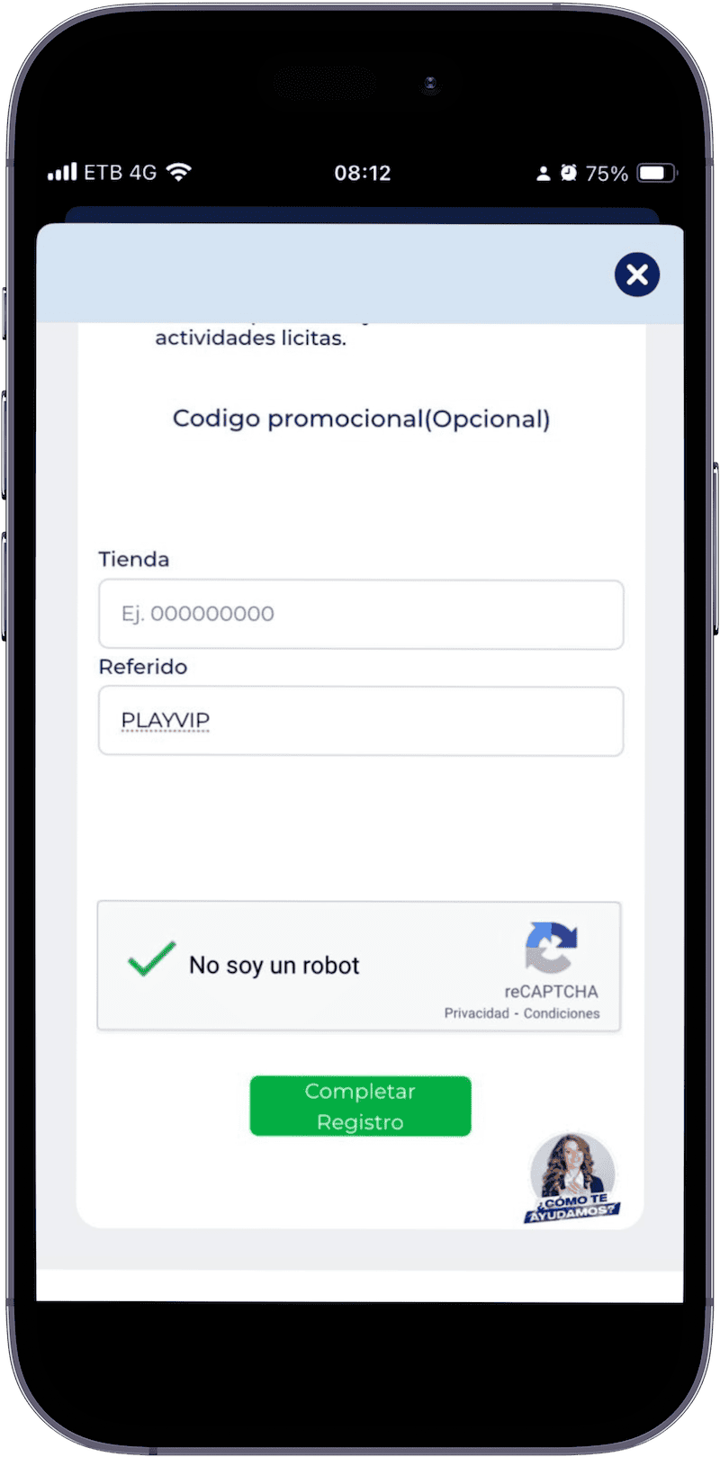 En la parte final del formulario, no olvides ingresar nuestro código promocional Betplay PLAYVIP. Este paso es importante para acceder al bono de bienvenida y promociones exclusivas.