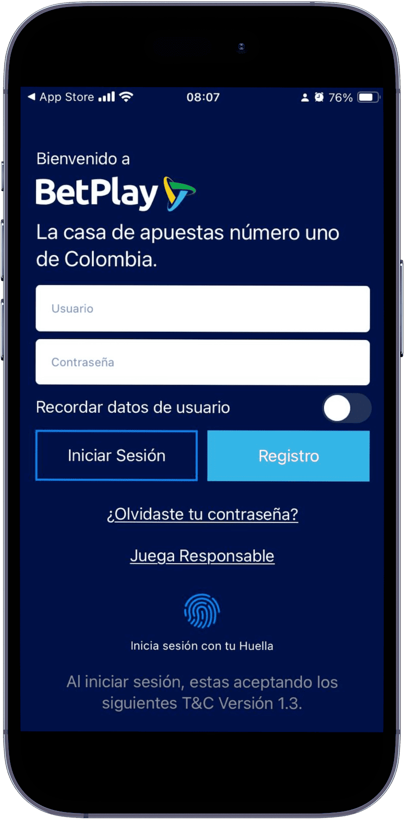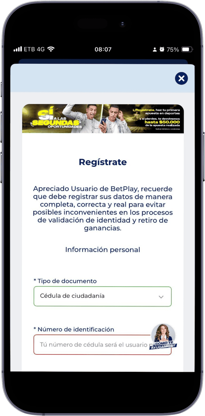 Visita la página oficial de BetPlay Colombia y haz clic en la opción “Registro” ubicada en la parte superior de la pantalla. Se abrirá un formulario donde deberás ingresar tu información personal, o usa directamente la aplicación del operador.